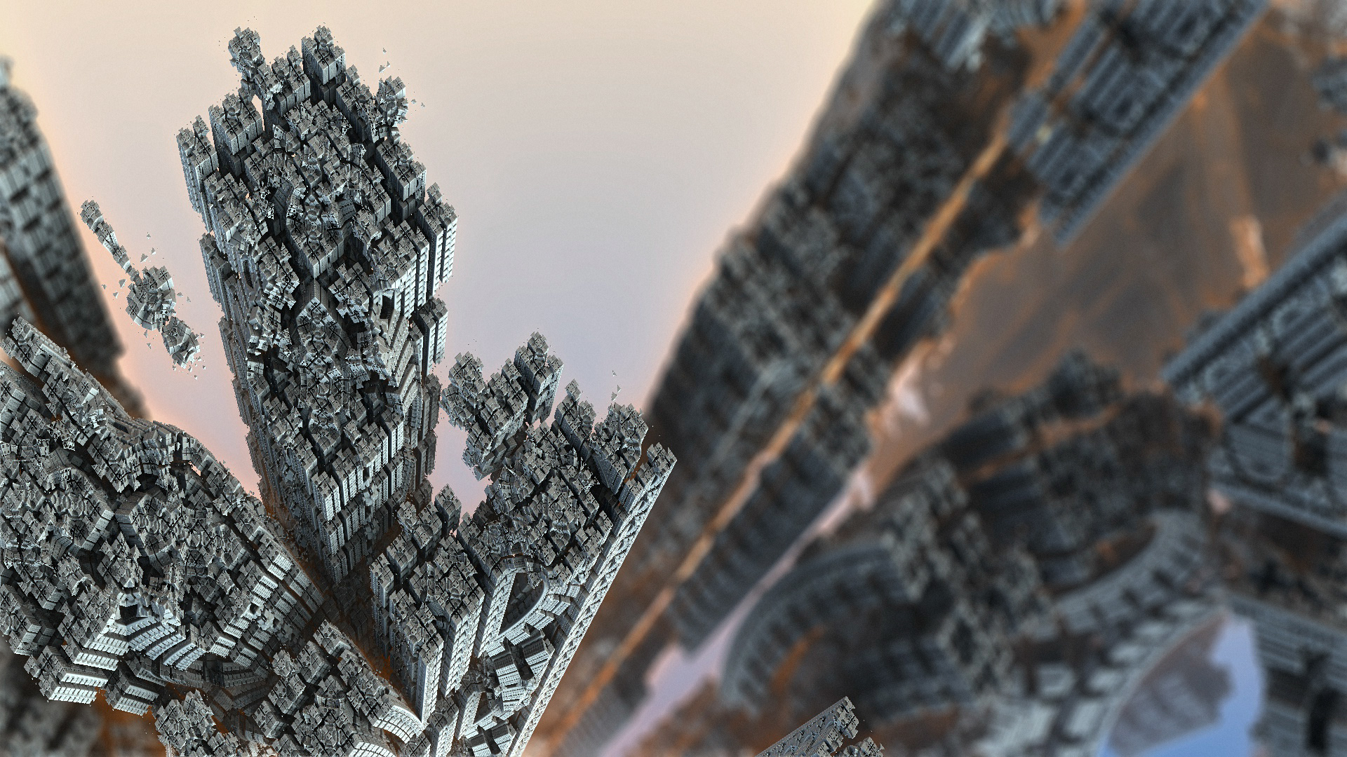 Simulación de viaje en un entorno fractal 3D. Probando algunos algoritmos y fórmulas para construir arte procedimental en 3D.